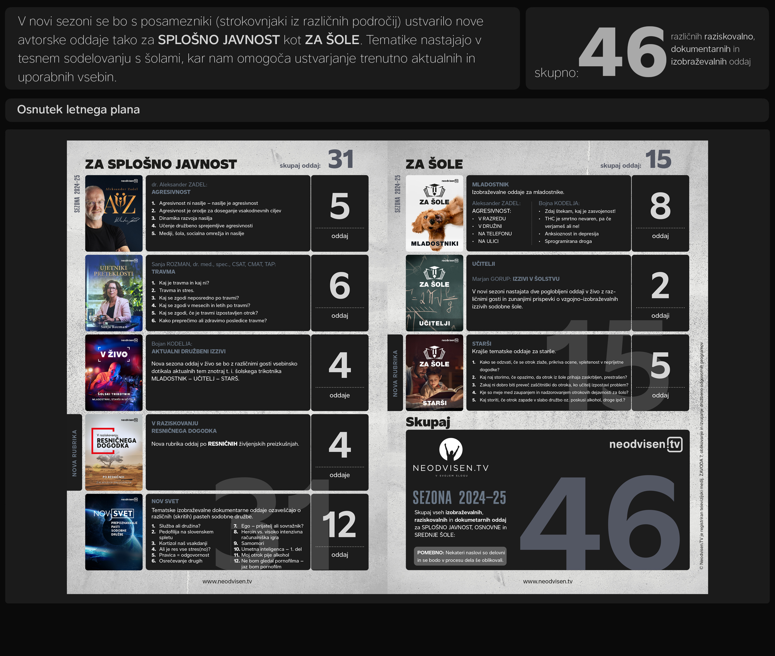 Neodvisen.TV z lastno produkcijo in v sodelovanju s posameznimi strokovnjaki ter različnimi institucijami, soustvarja visokokakovostne izobraževalne, raziskovalne in dokumentarne oddaje.
